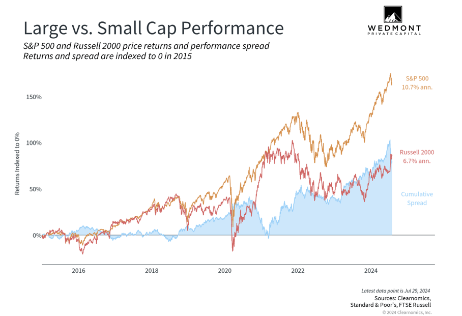 As the summer heats up, the stock market is experiencing its own heat wave in the form of rising volatility. Market uncertainty has climbed as investors rotate out of large cap technology stocks and into a broader array of sectors, sizes and styles, including small caps. Since their respective peaks in mid-July, the Nasdaq Composite Index has declined 7% and the S&P 500 is down about 4%. Meanwhile, the Russell 2000 index of small cap stocks has jumped over 11% since early July. Stock market swings are never pleasant, but fortunately, well balanced portfolios (like those at Wedmont) are positioned to weather these shifts.